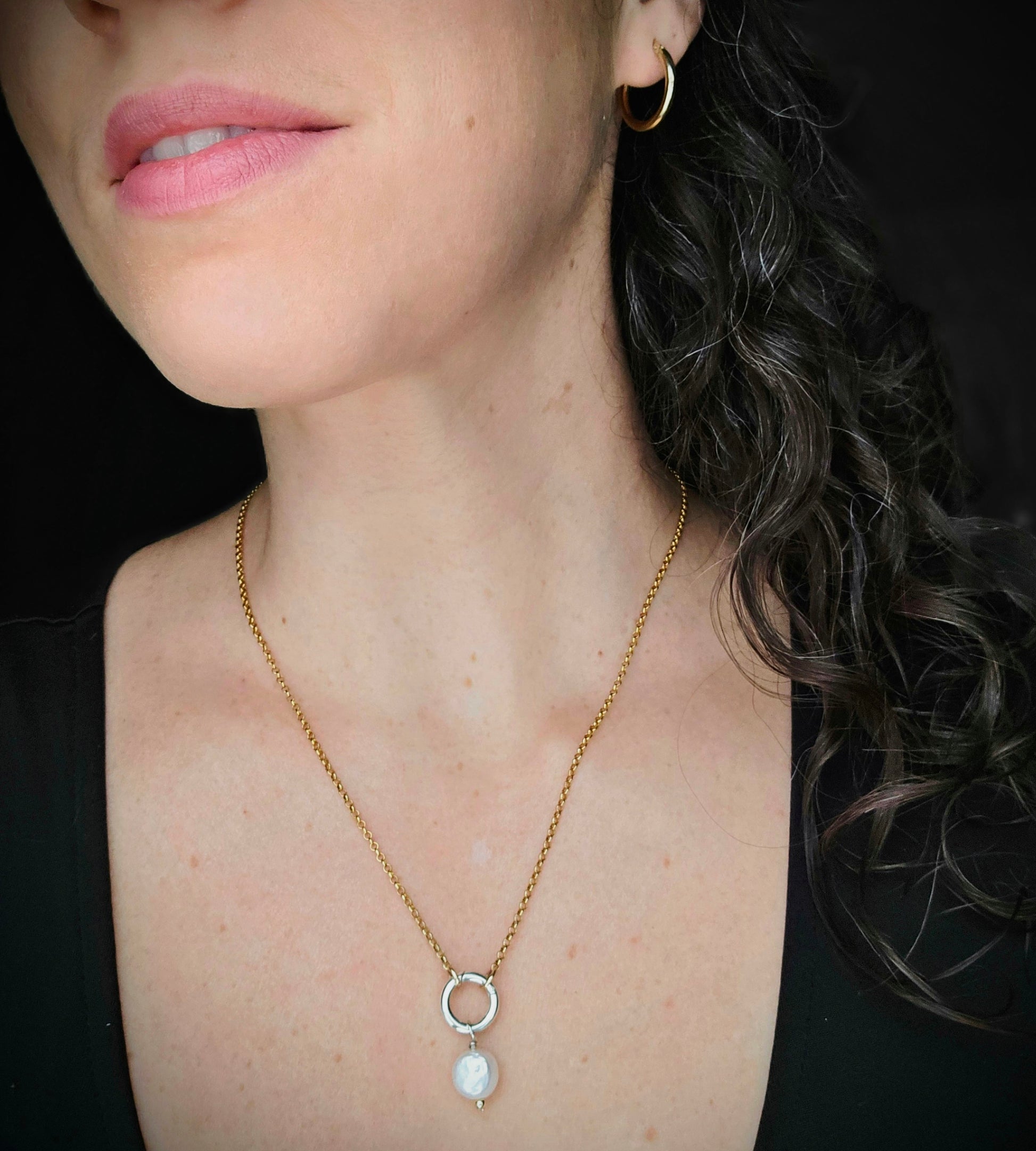 Cette chaine est en argent .925 recouvert d’un plaquage en or (appeler vermeille) offre un coté luxueux tout en restant abordable. La chaine a en con centre un anneau qui c’ouvre pour mettre un pendentif, ici une perle d’un format généreux y est insérée.